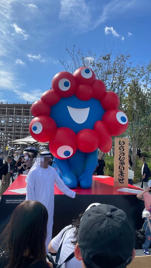 向かう道中に「いらっしゃいませ」の正座ミャクミャク像が。