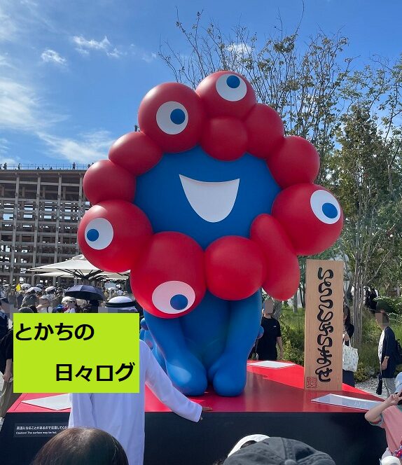 向かう道中に「いらっしゃいませ」の正座ミャクミャク像が。