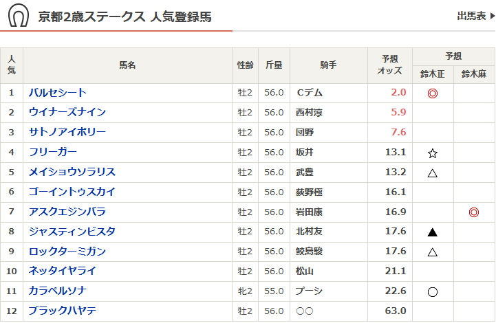 新馬戦で0.6秒差をつけて快勝したバルセシートが人気か。