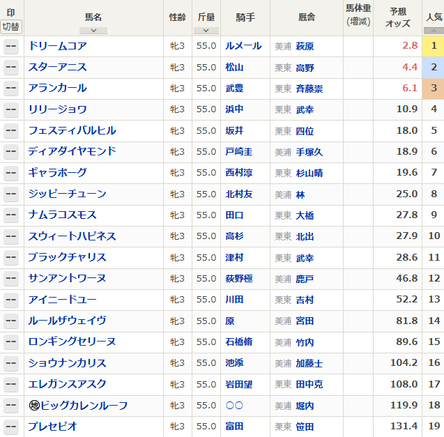 ラヴァンダやカピリナが無理やり評価を上げられてしまうのでしょうが、この3頭の順番をビタ当てするレースだと思っておきます。